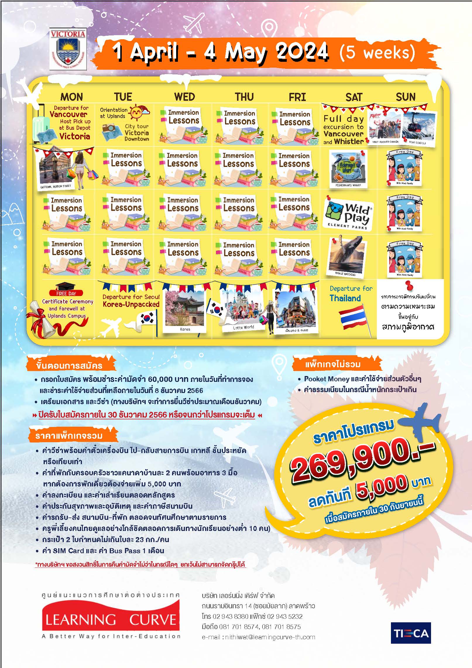 น้องๆ จะได้เรียนที่เมืองวิคตอเรีย เมืองที่ได้รับการยอมรับว่าเป็น CITY OF GARDENS ซึ่งเป็นเมืองที่น่าอยู่และมีความปลอดภัยติดอันดับต้นๆ ของโลก น้องๆ จะได้เข้าเรียนที่ VICTORIA SCHOOL DISTRICT (SD61) โดยสามารถเรียนตามหลักสูตรในชั้นเรียนร่วมกับนักเรียนเจ้าของภาษาในโรงเรียนรัฐบาลของแคนาดา 5 วันต่อสัปดาห์ รวมทั้งทำกิจกรรมร่วมกับเพื่อนๆ เพื่อพัฒนาภาษา เรียนรู้วัฒนธรรม ตลอดจนชีวิตความเป็นอยู่ของชาวแคนาดาตลอด 4 สัปดาห์ รับน้องๆ อายุ 12 ปีขึ้นไป
