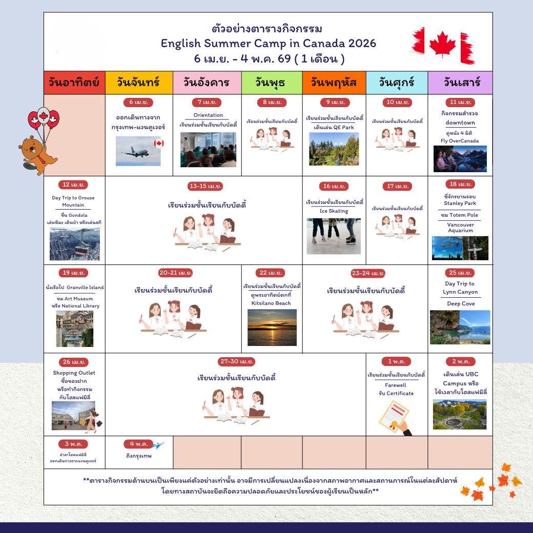 “ ตัวอย่างตารางกิจกรรม English Summer Camp in Canada 2026 ”