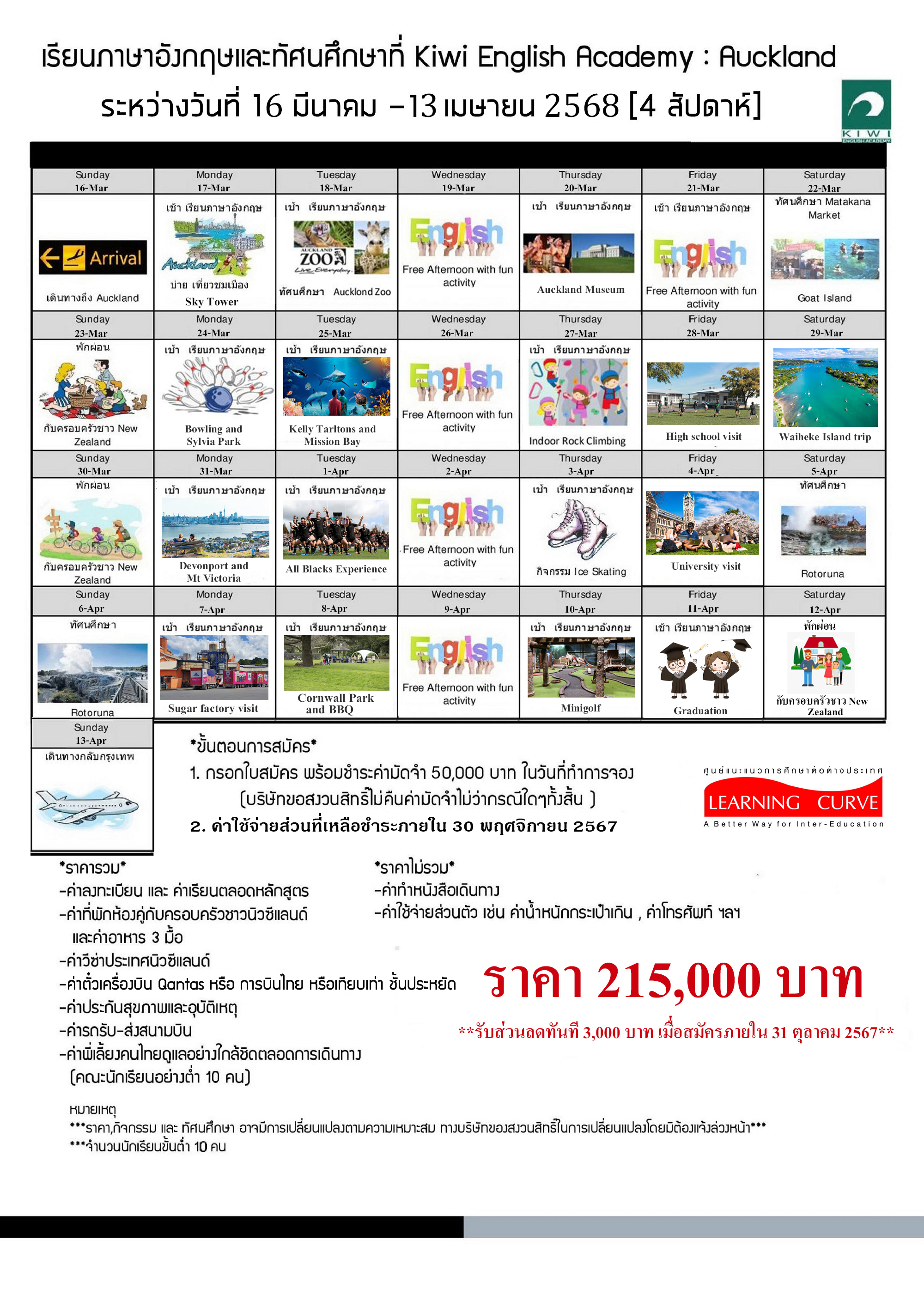 | สถานที่ทัศนศึกษา | หลังเลิกเรียน | หลังจากเลิกเรียน พาน้องๆ ไปทัศนศึกษาชมสถานที่ต่างๆในเมือง Auckland ทำกิจกรรมและแลกเปลี่ยนวัฒนธรรมร่วมกับนักเรียนชาวนิวซีแลนด์พร้อมกับร่วมทำกิจกรรมในวันหยุดวันอาทิตย์กับครอบครัว ชาวนิวซีแลนด์ด้วย |