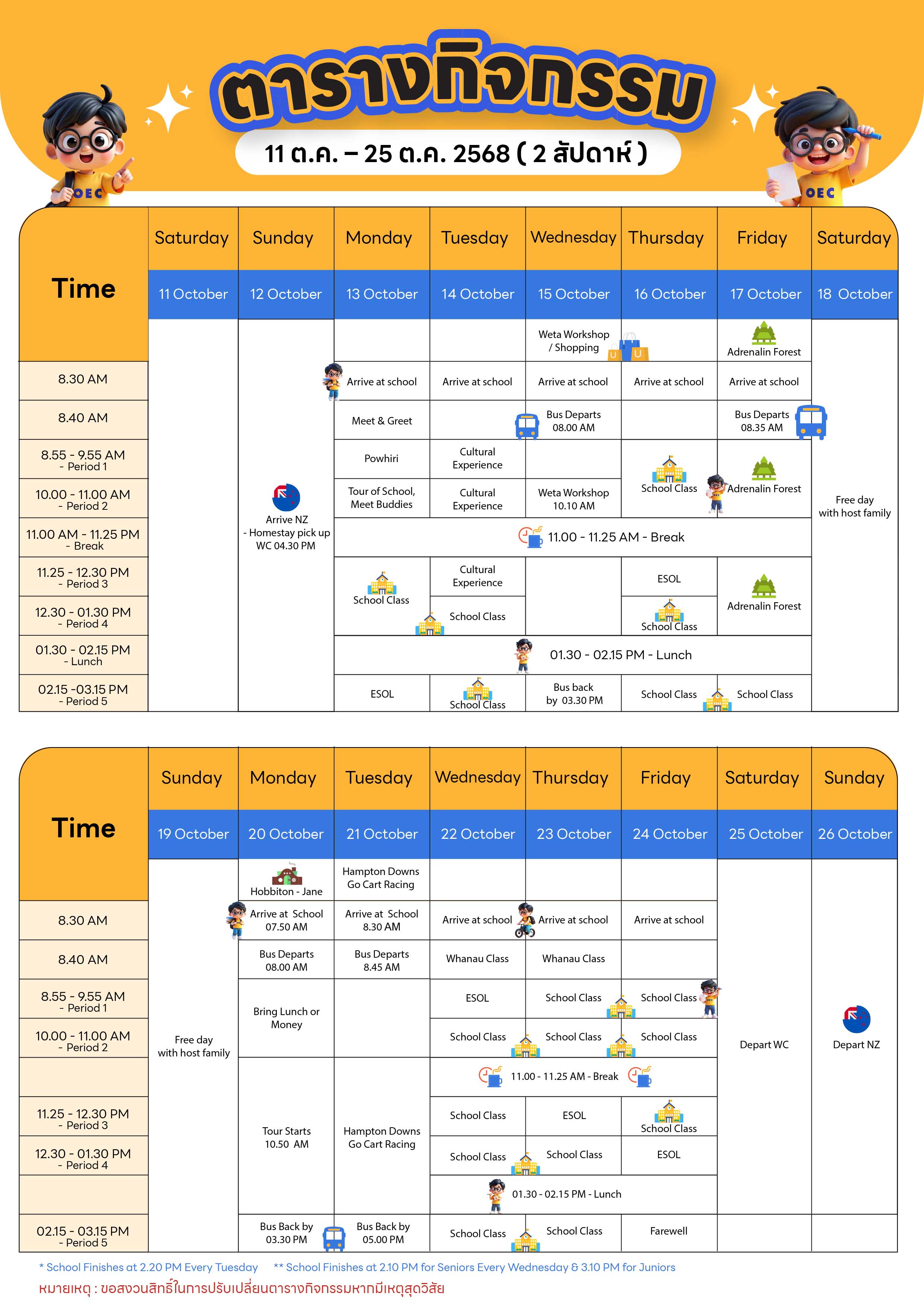“ ตารางกิจกรรมเเละเรียน Waiuku College: 2 สัปดาห์ ”