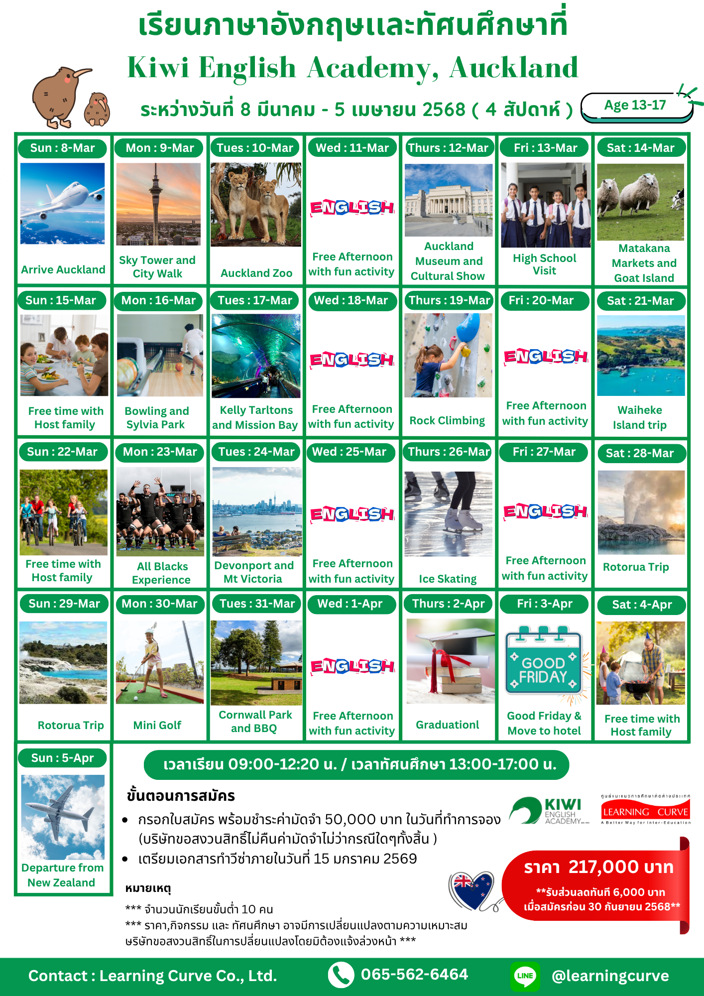 | สถานที่ทัศนศึกษา | หลังเลิกเรียน | หลังจากเลิกเรียน พาน้องๆ ไปทัศนศึกษาชมสถานที่ต่างๆในเมือง Auckland ทำกิจกรรมและแลกเปลี่ยนวัฒนธรรมร่วมกับนักเรียนชาวนิวซีแลนด์พร้อมกับร่วมทำกิจกรรมในวันหยุดวันอาทิตย์กับครอบครัว ชาวนิวซีแลนด์ด้วย |