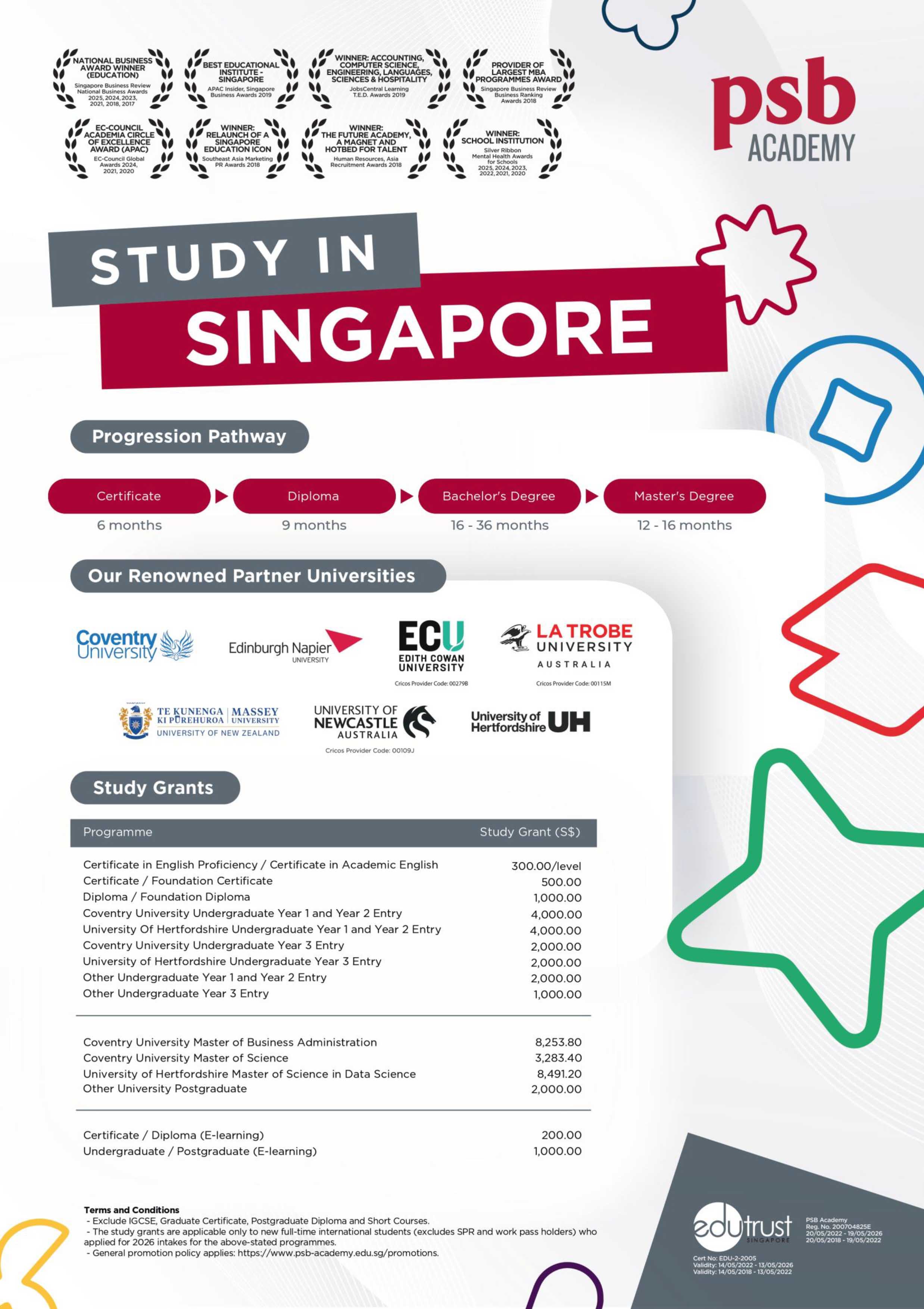 PSB Academy ได้รับการรับรองคุณภาพ EduTrust ซึ่งออกโดยคณะกรรมการการศึกษาเอกชนหรือ CPE (Council for Private Education) ด้วย และ ISO9001 อีกด้วย