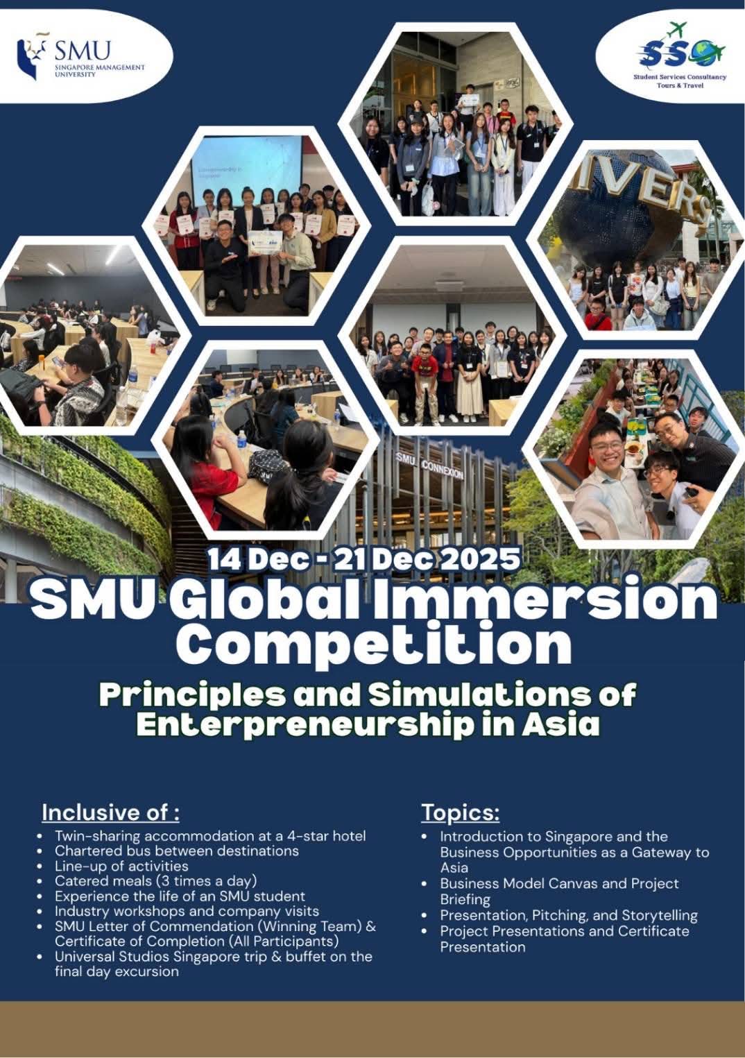 This programme serves as the academic component of a broader programme organised by SSC Tours and Travel, designed to introduce students to Singapore’s position as a gateway to Asia and a hub for business innovation. Combining contextual insights with practical frameworks, the programme equips students with tools to evaluate and develop business models. Working in teams, students will analyse selected companies using the Business Model Canvas and present their insights.