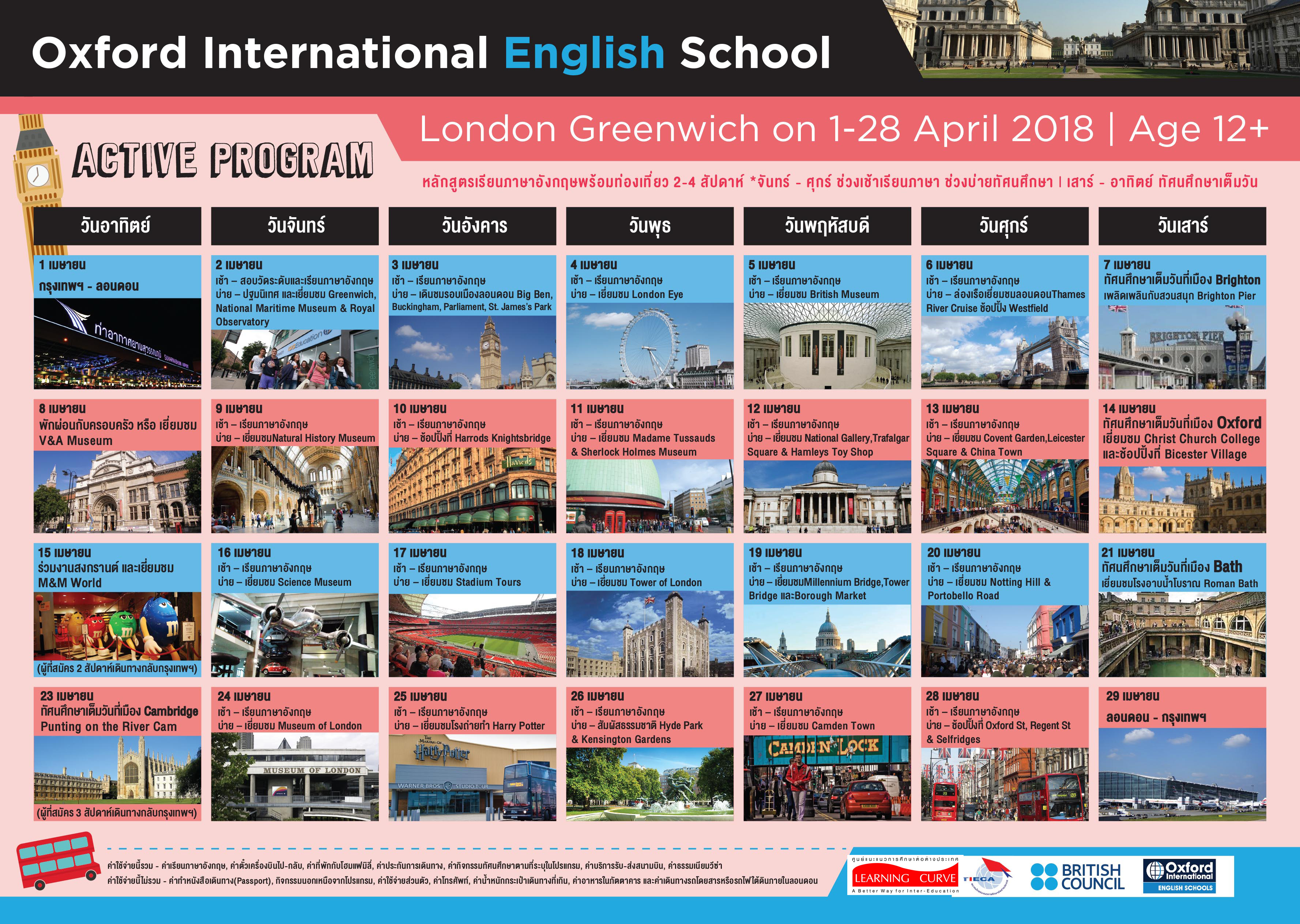 หลักสูตรเรียนภาษาอังกฤษพร้อมท่องเที่ยว 2-4 สัปดาห์ (สามารถเลือกไปได้) ช่วงเช้าเรียนภาษาอังกฤษ ส่วนช่วงบ่ายเรียนรู้เปิดโลกกว้าง เเละสัมผัสประสบการณ์ใหม่ๆ กับการเที่ยวชมสถานที่สำคัญต่างๆ เเละเเหล่งท่องเที่ยวที่น่าสนใจมากมาย อาทิ Greenwitch, National Maritime Museum, Royal Observatory, อาคารรัฐสภา, ทัวร์รอบเมืองลอนดอน, Westminster , St.James’s Park, Buckingham Palace, London Eye, Museum of London, ล่องเรือแม่น้ำ Thames, Tower of London, Tower Bridge, Millennium Bridge, St. Paul’s Cathedal, British Museum, Natural History Museum, Science Museum, Madame Tussaude, Sherlock Holmes Museum, National Gallery, Trafalgar Square, Hyde Park, Covent Gardent, V&A Museum, Leicester Square, Borough Market, Comden Town, Stadium Tours, Harry Potter Studio, ช้อปปิ้งที่ Oxford St, Harrods, Westfield, Notting Hill, Portobello Rd, M&M World, Hamleys, พาชิมร้านอาหารชื่อดัง และสนุกสนานกับกิจกรรมอื่นๆ อีกมากมาย