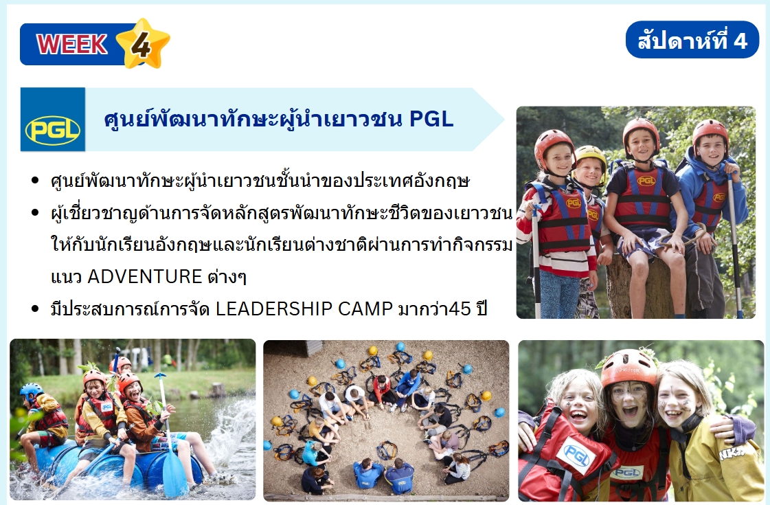 - สัปดาห์ที่ 4 : Camp Experience เข้าพักหอพักของสไตล์รีสอร์ทของ PGL