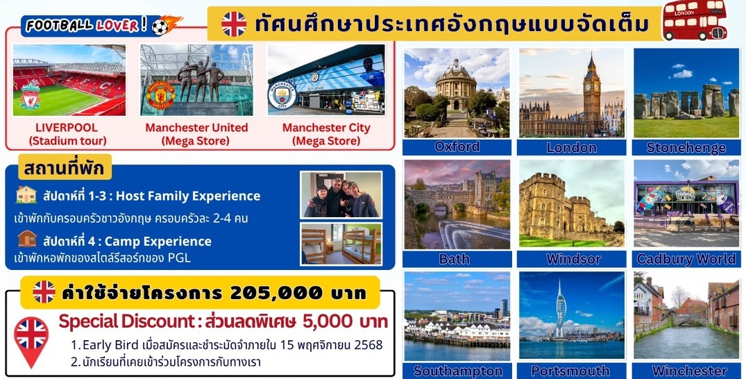 - สัปดาห์ที่ 1-3 : Host Family Experience เข้าพักกับครอบครัวชาวอังกฤษ ครอบครัวละ 2-4 คน