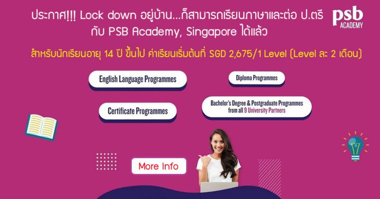 สำหรับน้องๆที่อยากเรียนต่อปริญญาตรีสาขาธุรกิจ สาขาวิศวกรรมศาสตร์ เป็นต้น สามารถเริ่มเรียนภาษาอังกฤษ ต่อด้วยคอร์ส Foundation และ คอร์ส Diploma กับ PSB Academy, Singapore ONLINE ในราคาแสนประหยัด เพียงจบ ม.4 ก้อเริ่มเรียนได้แล้ว ถ้าน้องๆ คนไหนสนใจอยากไปเรียนที่ประเทศสิงคโปร์ แต่ไม่สามารถเดินทางไปเรียนที่ประเทศสิงคโปร์ได้ในช่วงเวลานี้ สามารถสมัครเรียน online ได้นะคะ โปรแกรมนี้ช่วยให้น้องๆ สามารถวางแผนการเรียนต่อได้อย่างมีประสิทธิภาพ และเป็นเส้นทางการเรียนต่อปริญญาตรีให้จบได้ภายในเวลาประมาณ 2-3 ปีด้วยค่ะ . . .