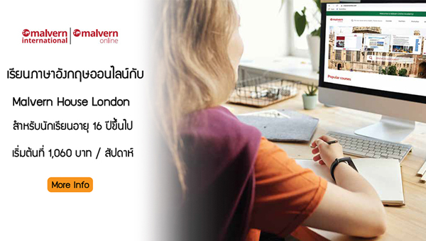 คอร์สเรียนภาษาอังกฤษสำหรับน้องๆ อายุ 16 ปี ขึ้นไป ปิดเทอมยาวครั้งนี้มาเรียนภาษาอังกฤษออนไลน์กับ Malvern House London เพียง 4-10 ชั่วโมง / สัปดาห์ อยู่บ้านก็เก่งภาษาอังกฤษได้ กับราคาโปรโมชั่นเริ่มต้นเพียง 1,060 บาทต่อสัปดาห์ . . .